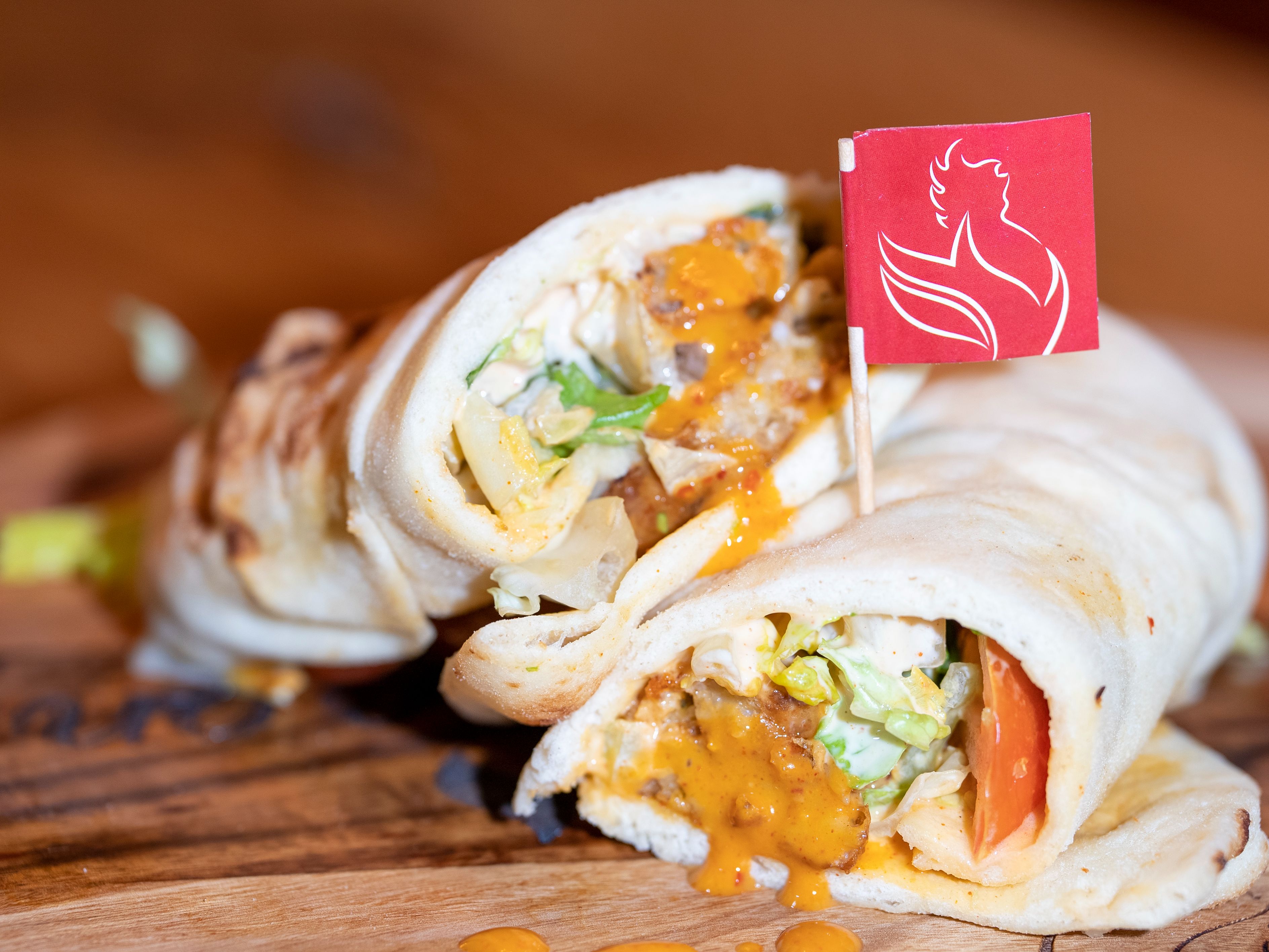 Lightly battered Peri Veggie patty rolled into a toasted pita with a spread of our home made PeriMayo, served with fresh romaine and tomato.