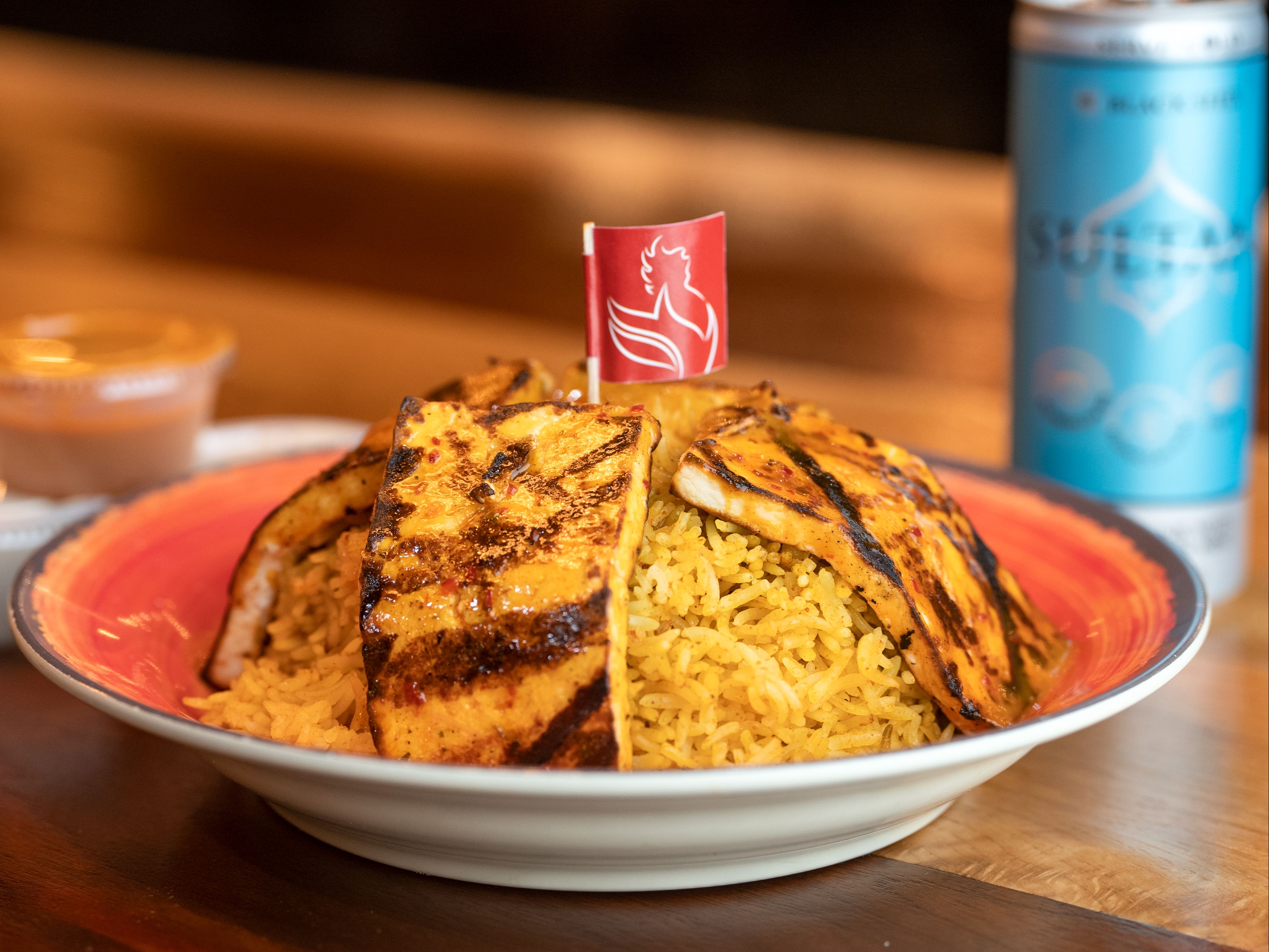 Taste the "dark side of the chicken" meat. Tender and flavorful to the bone. A marinated leg & Thigh quarter of the chicken steamed, then grilled and basted with your choice of sauce while on the grill. Paired with our signature PORT® Rice and our famous garlic sauce.
