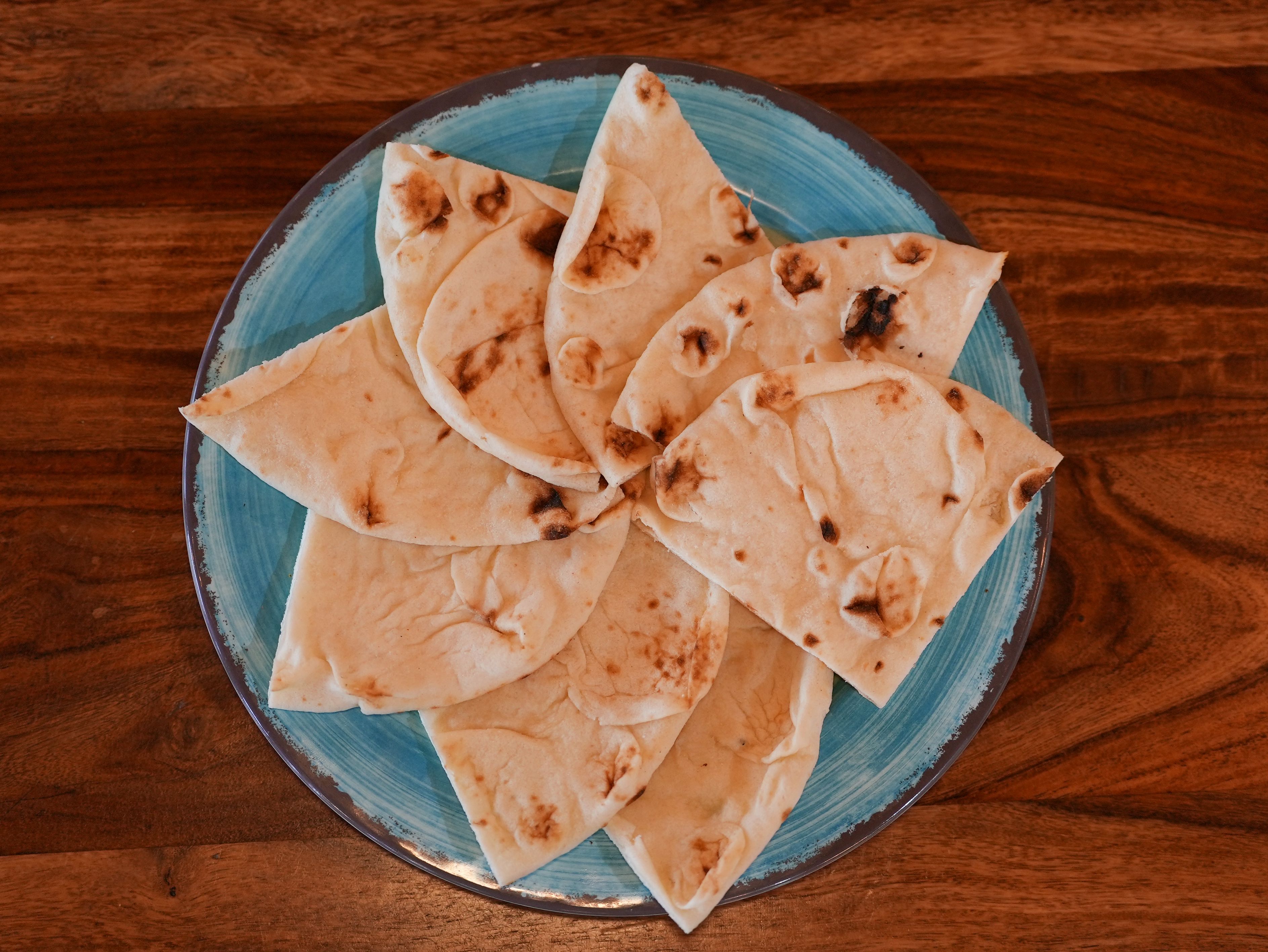 Hot toasted artisan flat bread, cut in four pieces. Made with an authentic Indian flatbread recipe which includes buttermilk and ghee, these hand-stretched breads offer a soft, tender dough with flavorful dairy notes.