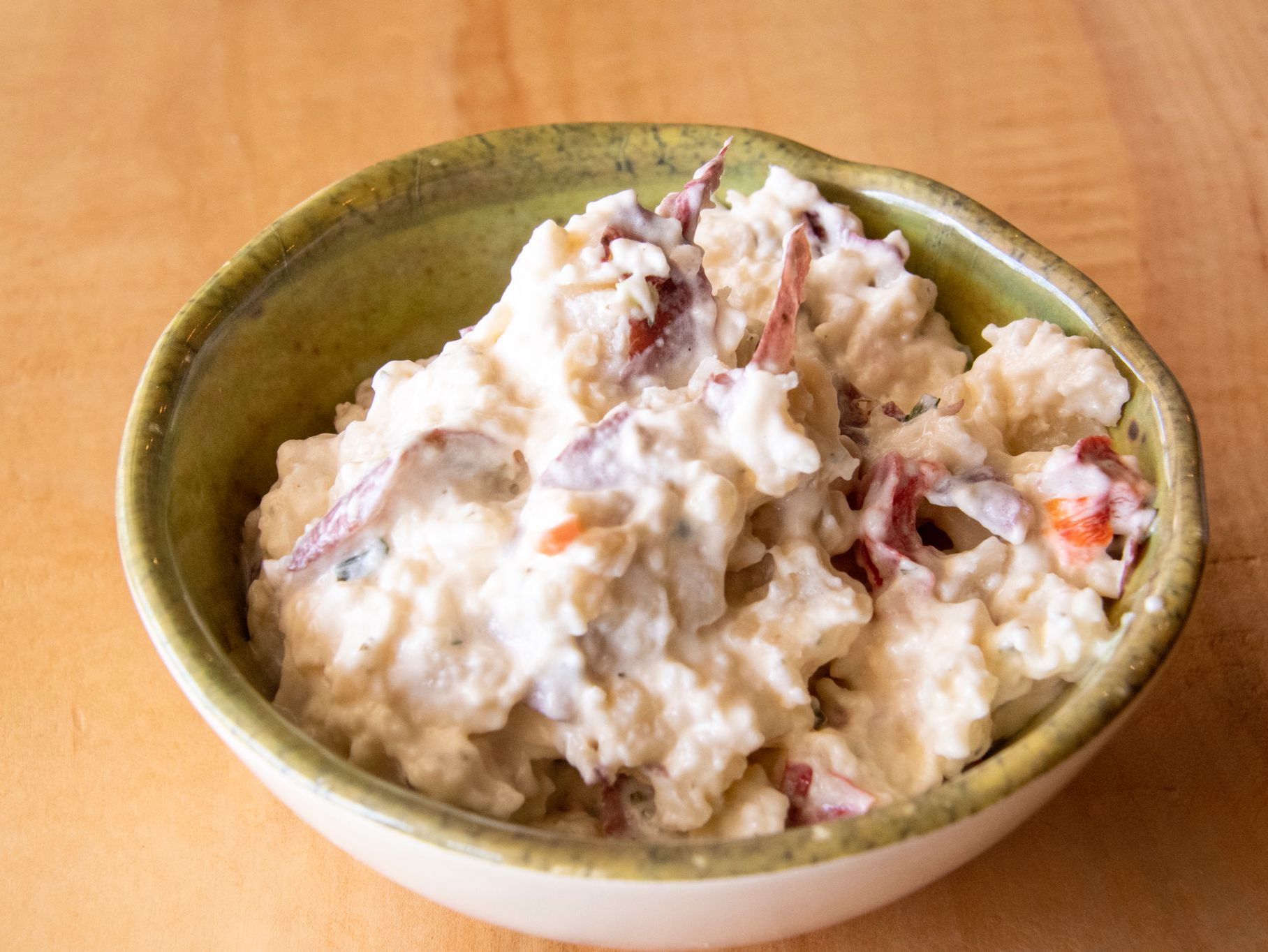 Fresh sliced red skinned potatoes in a creamy salad dressing making a wholesome chunky potato salad. With no trans-fat, no artificial colors, no artificial sweeteners or artificial favors.