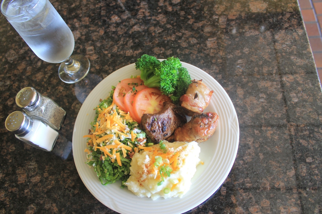 Beef bites, sauteed and served in a savory sauce over a bed of rice and a choice of fries or house salad