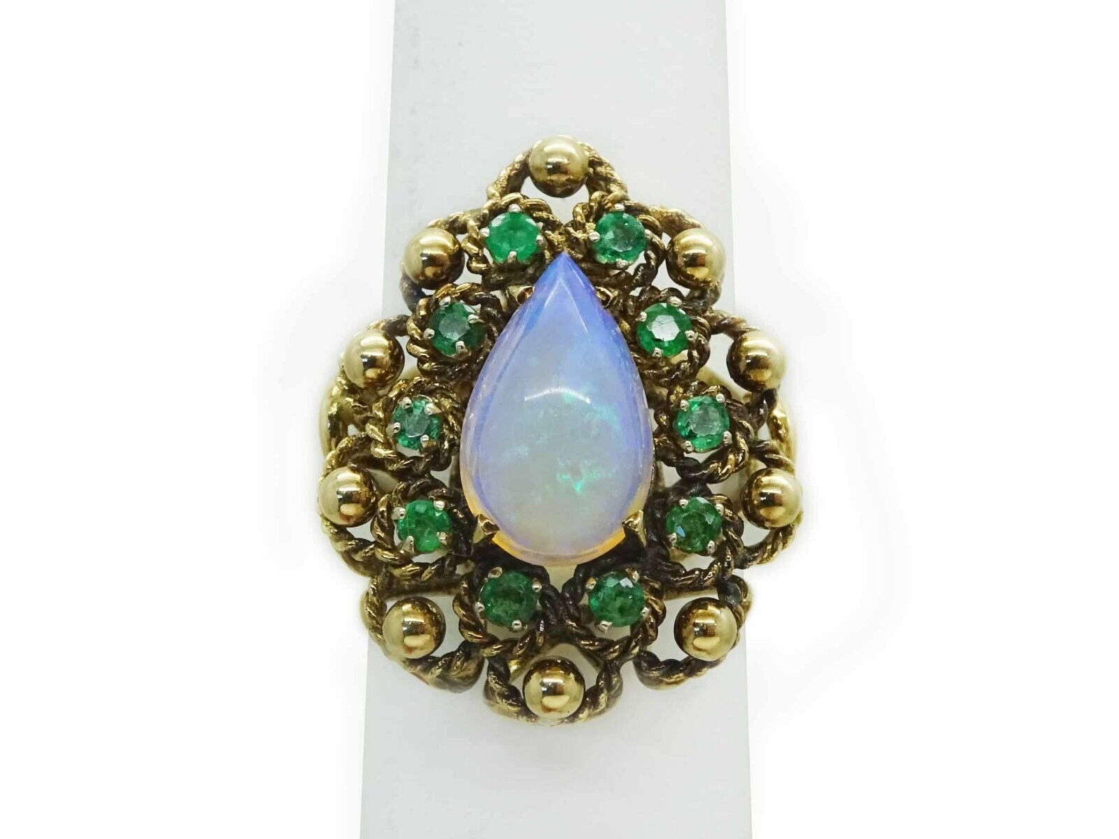 Ornate vintage cocktail filigree ring in 14k yellow gold. Set with center pear-cut natural jelly opal of superior glow and prismatic color shift. Light blue and violet predominate, with green, orange and rose highlights. Opal dimensions 13mm x 7.5mm x 5mm, at 1.85ct gem weight. Surrounding the opal are 10 round natural emeralds, each at 0.05ct for a total gem weight of 0.50ct tw. The emeralds are a lovely kelly green color, and complement the color of the opal beautifully. Overall gem weight at 2.35ct tw. Some of the emeralds have small flaws from light wear, which is to be expected in a vintage ring (circa 1950s-1960s, possibly earlier). The ring itself has a raised gallery. The emeralds are set above circles of fine rope wire, and beneath the emeralds are 2.5mm gold balls which are also enhanced with fine rope wire. We believe this ring to be a handmade, one-of-a-kind piece. Marked 14k. Ring finger size 6.5. Weighs 7.8 grams. Ring setting in front is about 25mm x 20mm, rising 12mm above the finger. Band narrows to about 3mm wide in back. Excellent estate condition. Gently pre-owned. We will ship the ring as is. We do not offer resizing through online purchases, but you may take it to a local jeweler near you for resizing. Please note that some rings may not be resizable due to the ring’s material, overall ring design, or gemstone setting.
