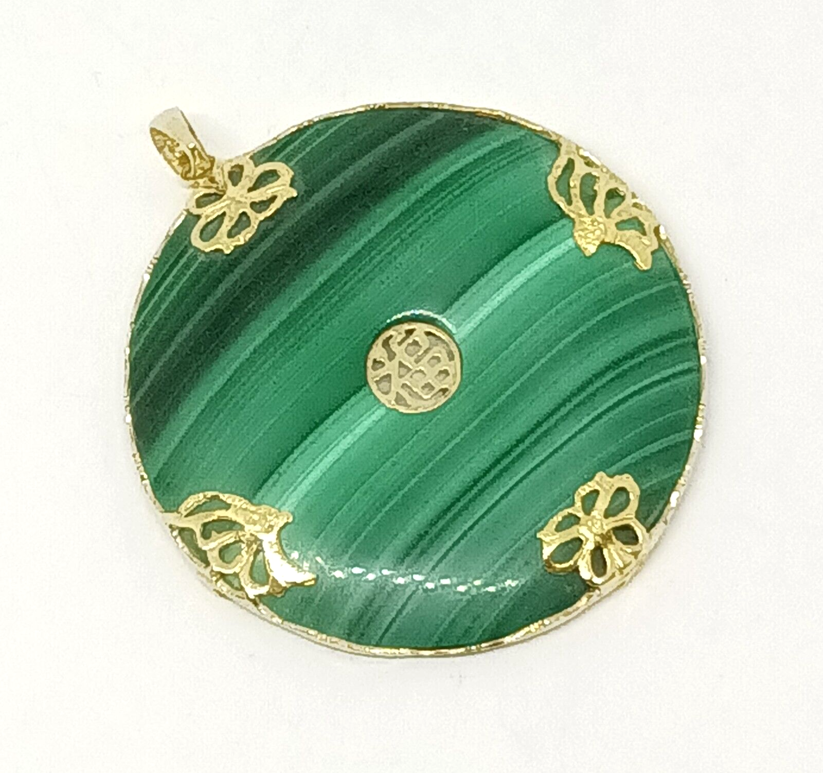 Beautiful 14k yellow gold malachite good fortune butterfly disc/donut pendant. The round malachite gemstone is set in a 14k gold bezel with butterflies. The symbol in the middle of the pendant means good fortune or luck in Chinese. Malachite disk is 35mm in diameter and 3.5mm thick. Pendant is 37mm wide and 45mm tall. Marked 14k and Hong Kong. Weighs 11.0 grams. Excellent estate condition. Gently pre-owned.