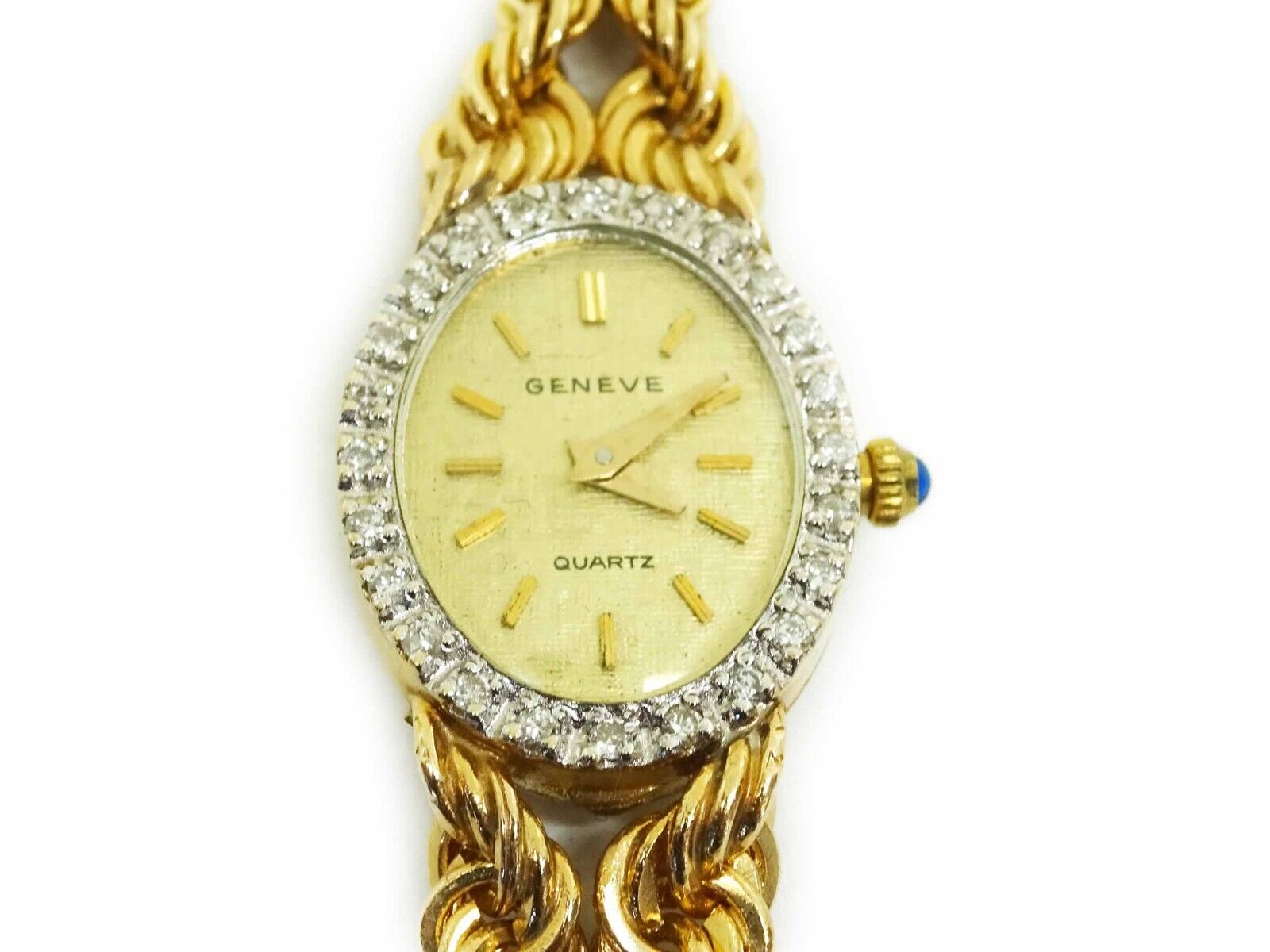 Estate Geneve quartz movement wristwatch with 14k yellow gold case and straps. Oval bezel is set with 24 round brilliant natural earth mined diamonds, at 0.50ct tw gem weight. Case back is marked J 14k Gold. Strap clasp is marked 14k P Pend. Total weight is 17.7 grams. Watch case is about 17mm wide x 21mm tall x 6mm deep. Watch is specially fitted for a wrist length of about 6.5". Running and keeping time. Excellent estate condition. Gently pre-owned.