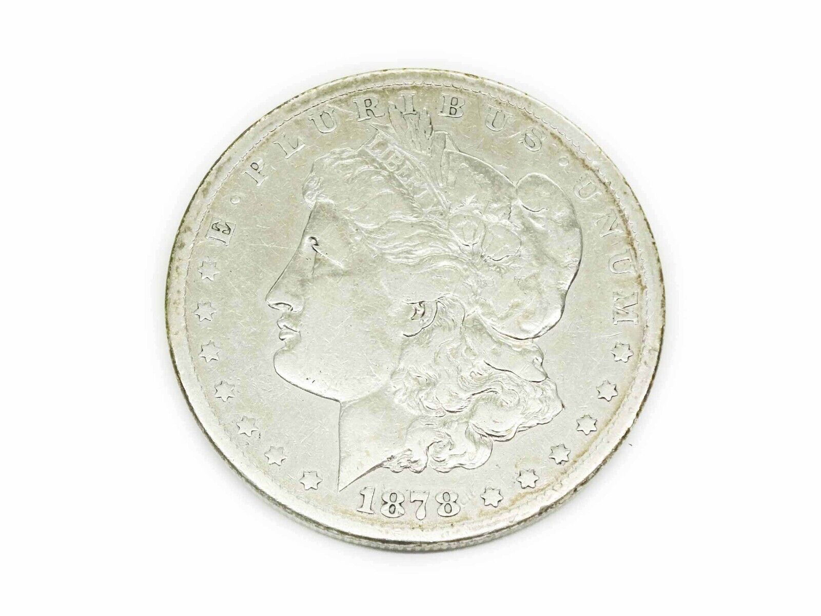 1878-CC Morgan silver dollar coin. Key date, both as a First-Year Issue and the first to come from the Carson City Mint. Fine condition, not professionally graded.